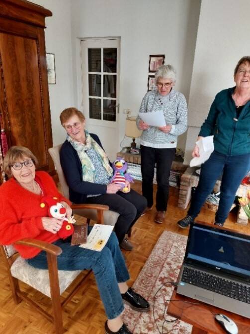 Annie en Anneke maar zoeken naar Joke en Jet, helaas alleen Joke gevonden. Bij onze nieuwjaarsreceptie wilden we hen verrassen, helaas Jet was ziek. Maar ook met Jet is het goed gekomen. Jet wist er niks van maar we hebben haar thuis verrast met het Eva-Zonnetje en Annie en Anneke hebben ook daar het speciale lied gezongen.